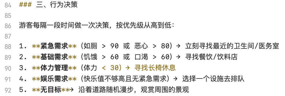 1. 术语表。 一个系统要被规范化地、准确地描述,明确的术语定义必不可少。以游客系统为例:游客的”快乐值”到底是什么?它影响哪些其他系统?游客的决策会产生一组可叠加的状态还是单一行为?”游乐设施”包不包括商店?这些歧义如果不提前解决,AI 会按自己的理解来,等你发现时可能已经基于错误的理解写了好几百行代码了。